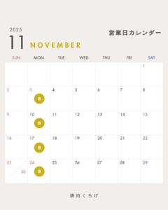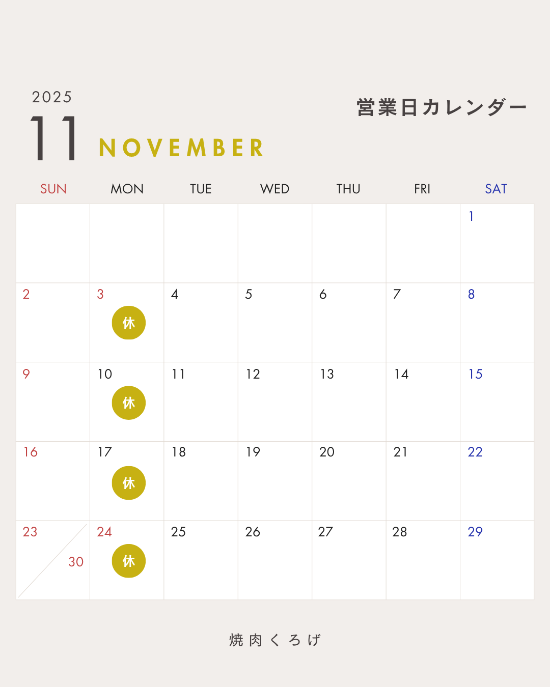 11月の定休日のお知らせ 2025/10/27 全店 いつも焼肉くろげをご利用いただきありがとうございます。 11月の定休日についてお知らせです。 山形駅前店・紀尾井町店ともに、3日、10日、17日、24日がお休みとなります。 11月は通常通り、毎週月曜日が定休日です。 皆様のご来店を心よりお待ちしております。 前のページ