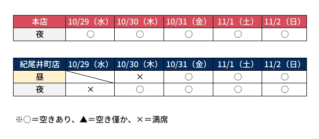 本店&紀尾井町の今週の予約状況について(10月29日現在) 2025/10/29 全店 いつも焼肉くろげをご利用いただきありがとうございます。 本店および紀尾井町店の今週(10月29日~11月2日)の予約状況についてお知らせです。 本店は、全日お席に余裕がございます。 紀尾井町店は、10月29日(水)の夜、30日(木)の昼は満席です。 予約状況は常に変動しますので、ご予約の際は、お早めにご連絡をお願いいたします。 皆様のご来店を心よりお待ちしております。 前のページ